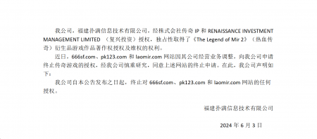 2024-06-03福建撲滿信息技術(shù)有限公司(以下簡(jiǎn)稱(chēng)“我司”)經(jīng)株式會(huì)社傳奇IP、RENAISSANCEINVESTM...